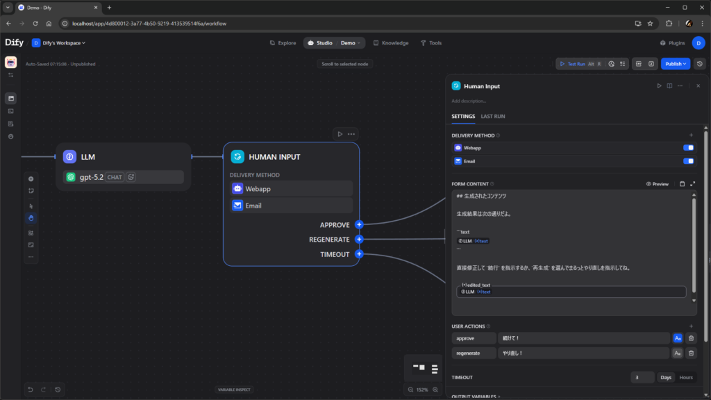 この機能は、ワークフローの編集画面で、あたらしく Human Input ノード を配置すると使えるようになります。こんなイメージです。