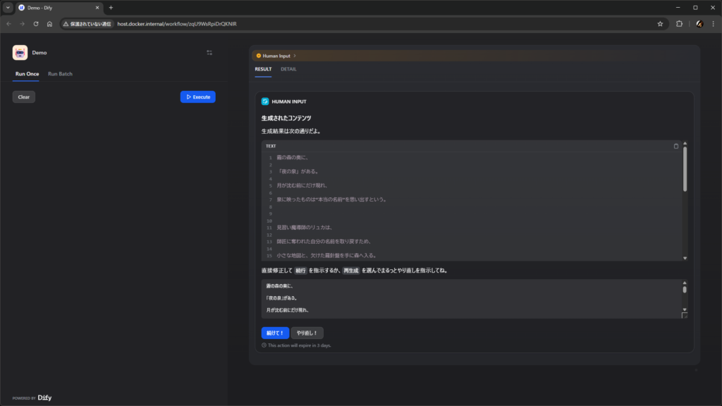 ワークフローの途中で処理をいったん止めて、人間からの入力を待ってから次に進む機能です。続行前に承認を求めたり、入力に応じて処理を分岐させたりできます。たぶん 1.13.0 でリリースされます。