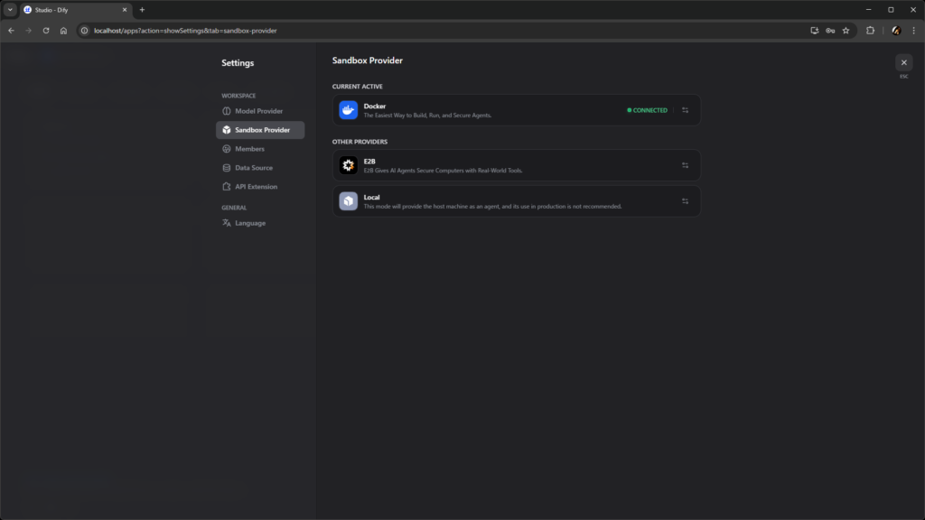 サンドボックス環境には、Docker コンテナ、E2B(AI 向けのサンドボックス環境を提供するプラットフォーム)、ローカルホストのいずれかが利用できます。