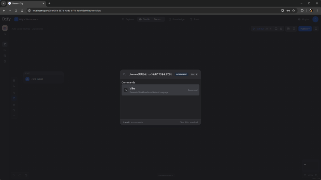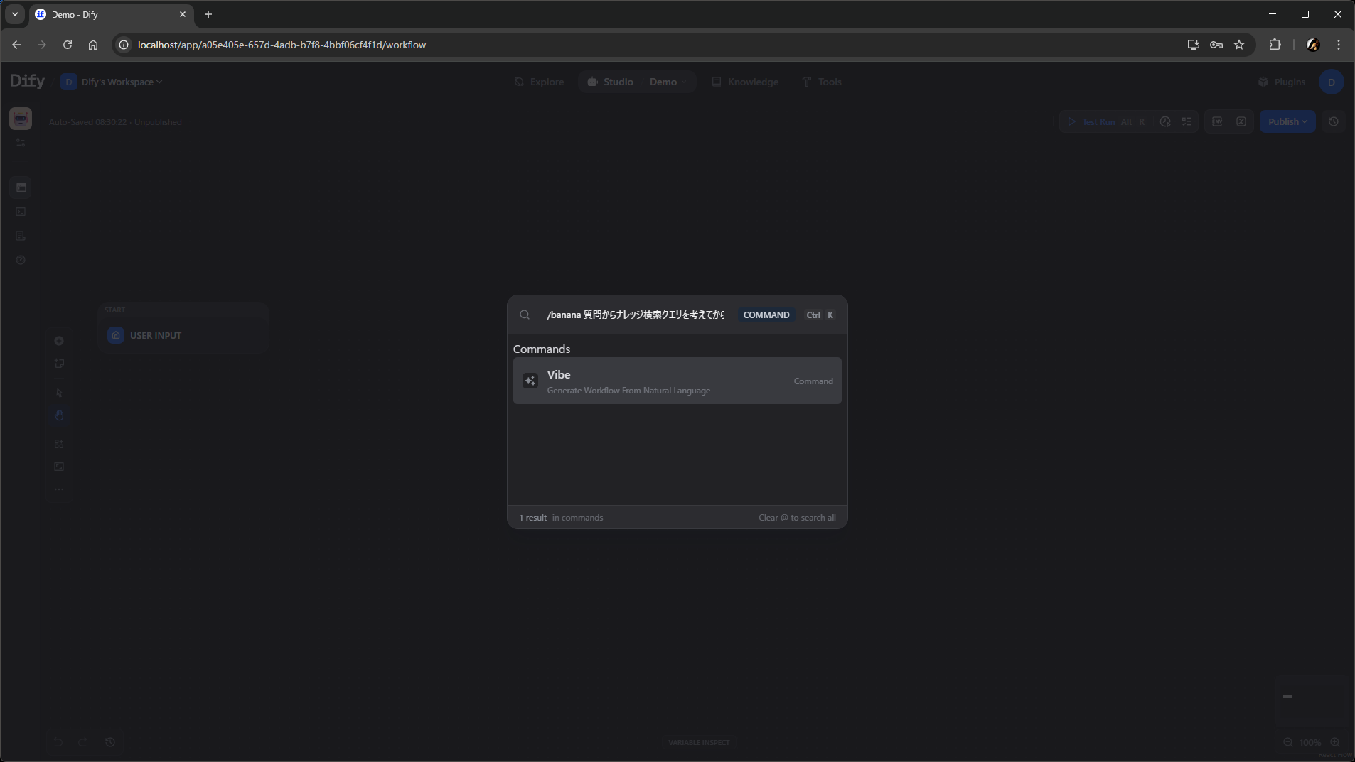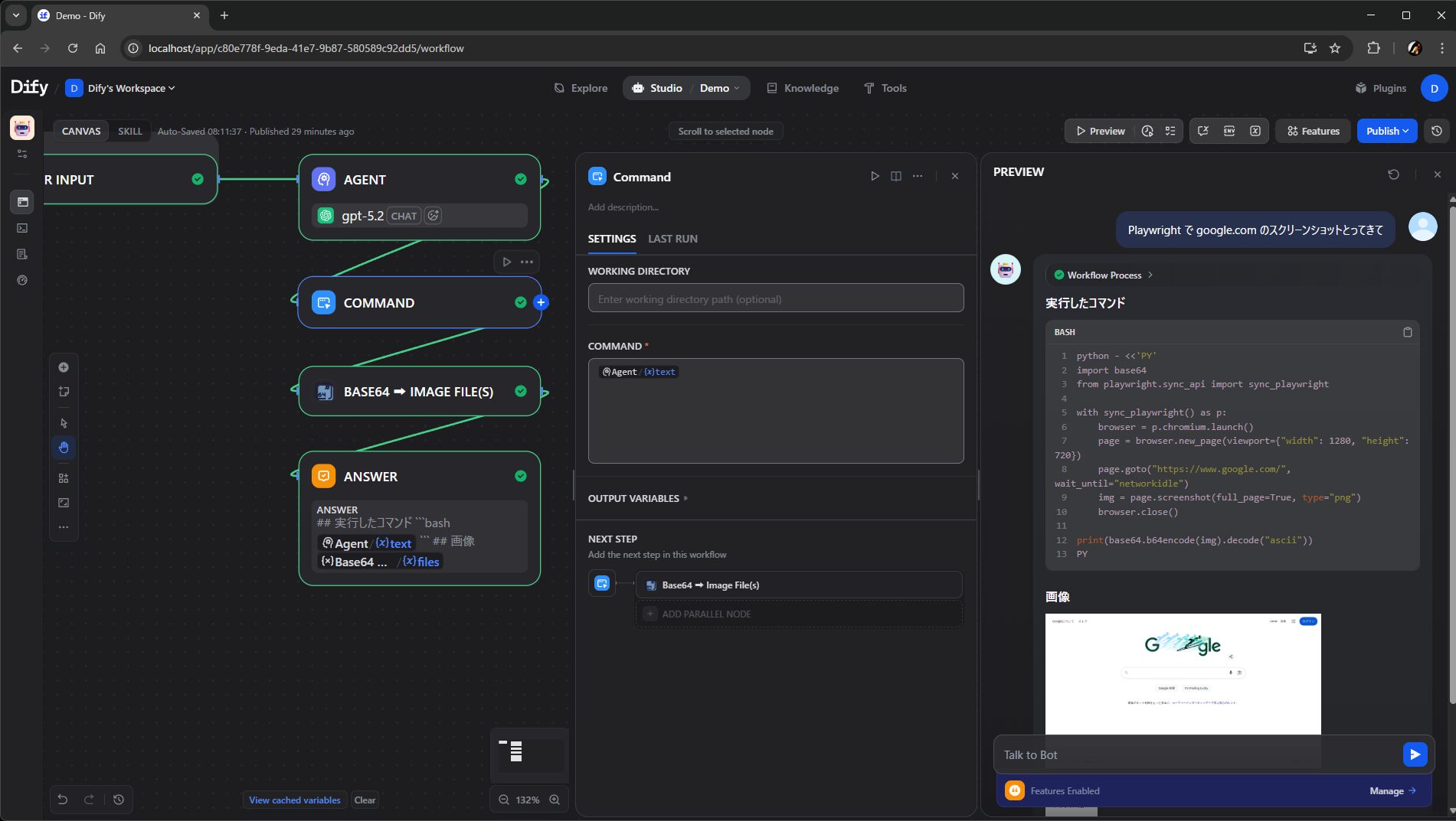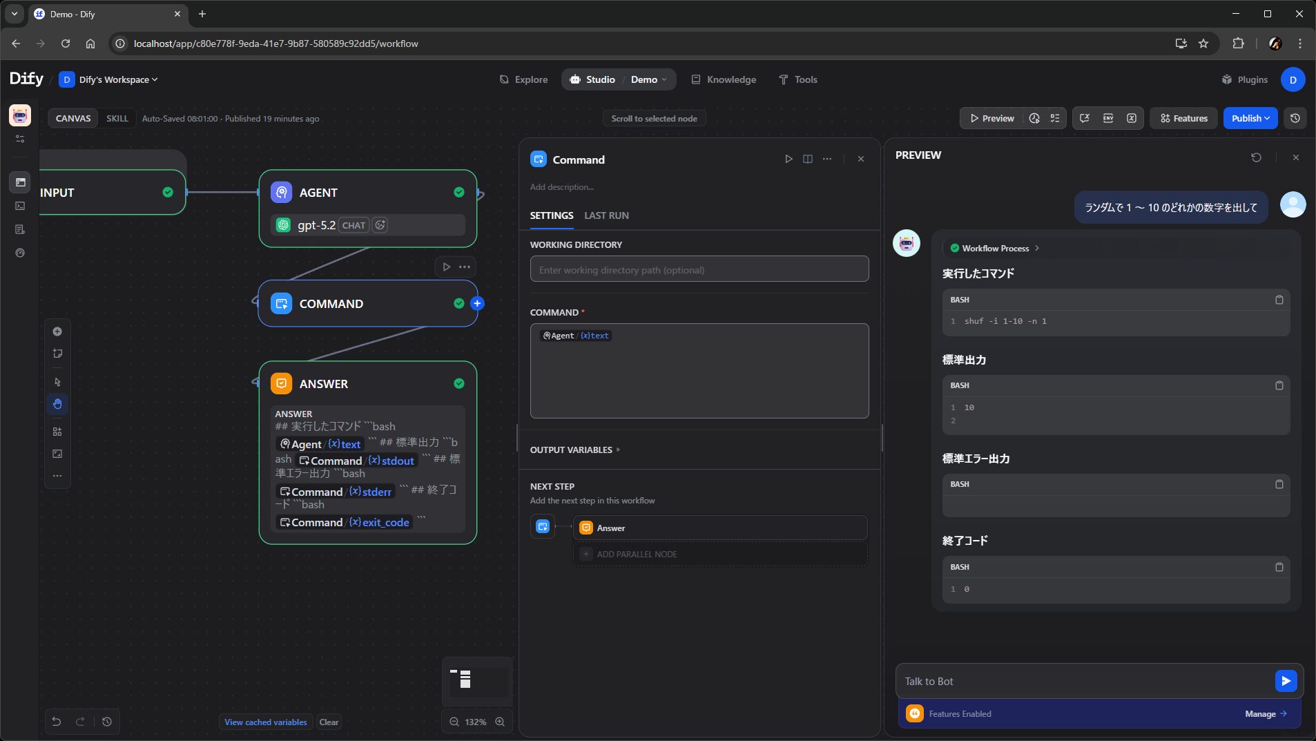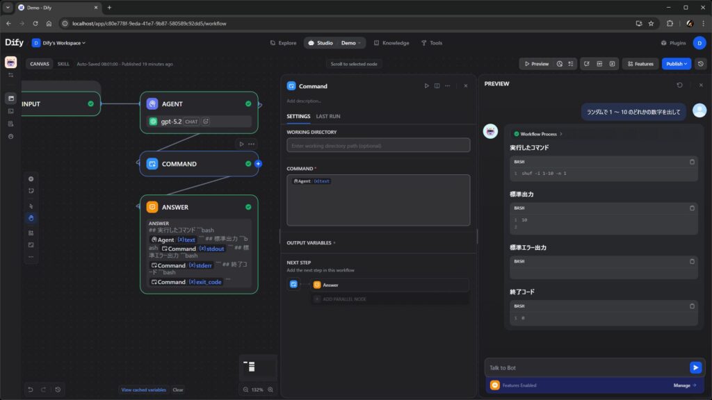 また、ツール経由の実行だけでなく、あたらしく Command ノード も追加され、これ単体でもサンドボックス環境の中で任意のコマンドを実行できるようになります。手書きしてもよいですし、LLM にコマンドを生成させてそれを変数で渡すのももちろんアリです。