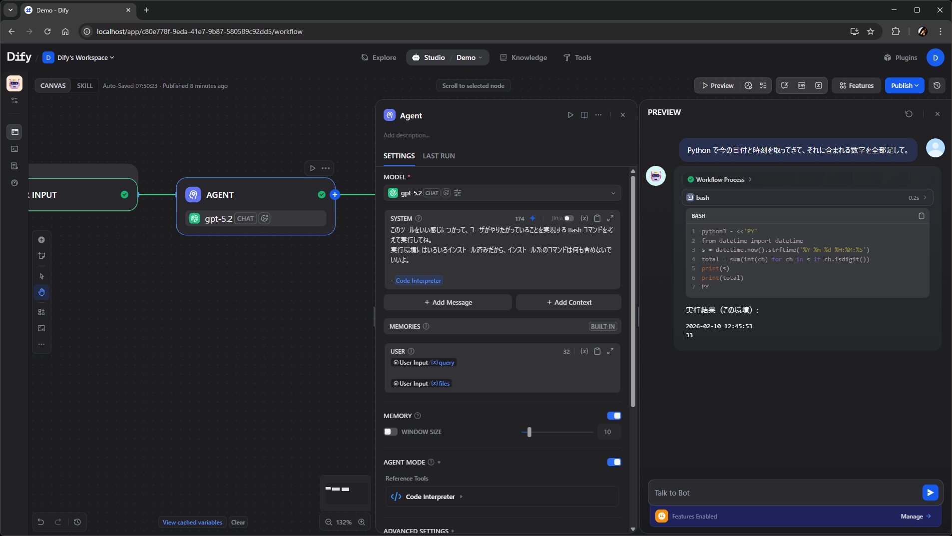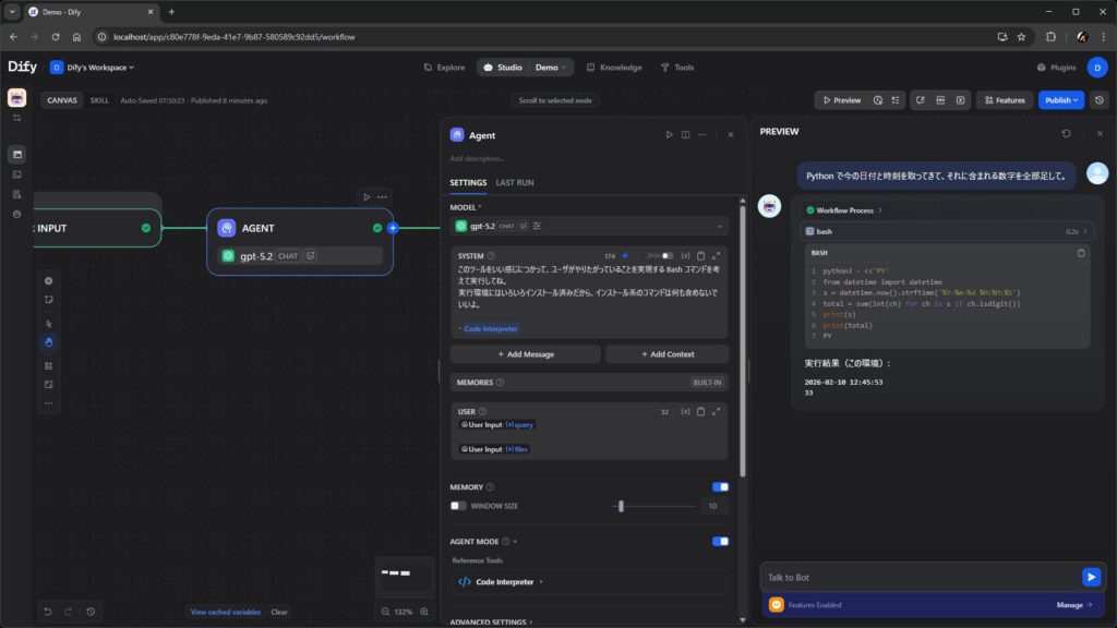 組み込みで新しいツール Code Interpreter が実装されており、例えば Agent ノードにこのツールを渡すことで、LLM がサンドボックス環境の中で自由に Bash を触ってコマンドやコードを実行できるようになる感じです。