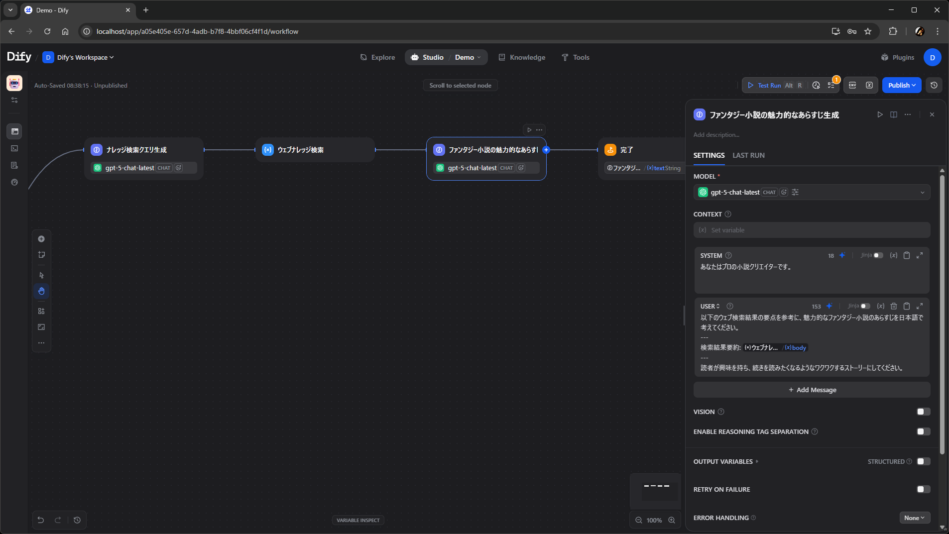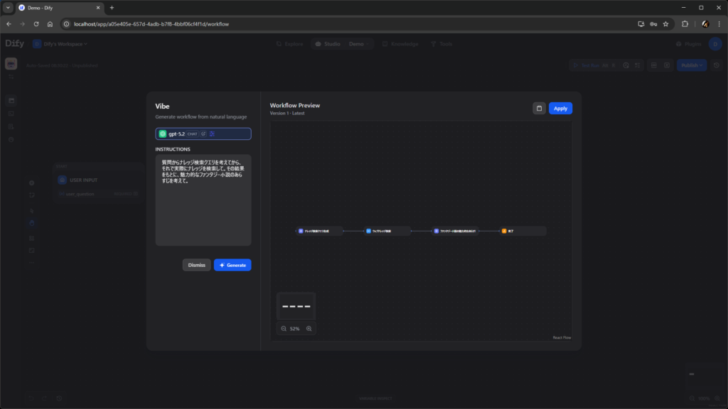 生成されたワークフローは右側でプレビューされ、いいやつができたらそのまま編集画面に持ち込めます。各ノードの設定(例えば LLM ノードのプロンプト)も含めて生成されるようです。